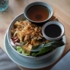 Meine Begleiter, Oliver und Paul, sind Liebhaber von Fleischgerichten, aber selbstverständlich offen für jede Art von Genüssen. Wir bestellen als Vorspeise Sommerrollen, Dumplings und einen Mangosalat. Vegan. Jeder von uns probiert alles. Die Sommerrollen sind vorzüglich knackig und mit pinken Glasnudeln, Gemüse und Austernpilzen gefüllt. Ein echter Tipp. Beim Mangosalat, der mit „Entenstreifen“ aus Seitan zubereitet ist, bemerkt Oliver die fehlende Fischsauce, die traditionell den salzig-seltsamen Gegenpart zur süßen Frucht gibt. In der veganen Version ist es eine andere Art Salat, die frisch und belebend den ersten Appetit besänftigt.