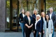 Das Team des Münchner Kongressbüros präsentiert sich auf den Stufe der Glyptothek am Königsplatz in Tracht.