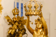 Die Putten, nackte Kinderengel-Figuren, sind die Galionsfiguren des Schlittens und halten Herrschaftsinsignien: Schwert, Zepter, Lorbeerkranz und ganz oben eine Krone. Die Krone und die beiden Seitenlampen leuchteten – und das war zu Ludwigs Zeiten eine Sensation. Denn für das Licht waren seit 1879 keine Kerzen verantwortlich, sondern Glühbirnen.
