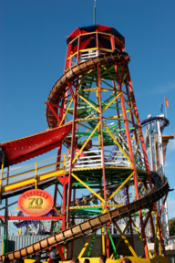 Damals hieß unser Turm noch „Trottoir Roil- and Canadian Elektro-Toboggan – H. Konrad“, war zehn Meter höher und hatte zwei Rutschbahnen. Später wurde eine Rutsche entfernt und der Turm verkürzt, um das Fahrgeschäft leichter auf- und abbauen zu können. Mit ihm sind die Großeltern viele Jahre durch Deutschland, Italien, Österreich, Ungarn und Kroatien gereist, 1933 stand er zum ersten Mal auf dem Oktoberfest in München. Ich lag schon als Baby in unserem Holzschindelwohnwagen mit den Vollgummirädern neben dem Toboggan und hab geholfen, sobald ich stehen konnte.