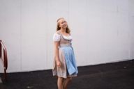 „Dieses Ensemble ist eine günstige Variante, zu sehen an der Passform und der Verarbeitung des Dirndls. Leider etwas zu kurz.“ (Eileen Popielaty)