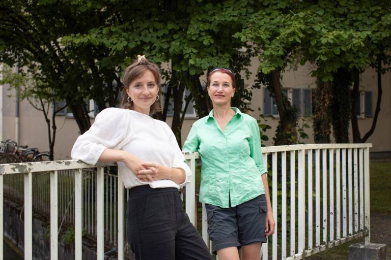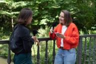 Zwei Frauen stehen mit Mikrofonen auf einer Brücke im Grünen und unterhalten sich.