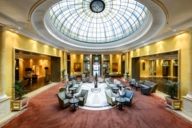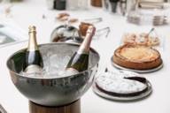 Kuchen und Champagner im Foyer eines Hotels in München.