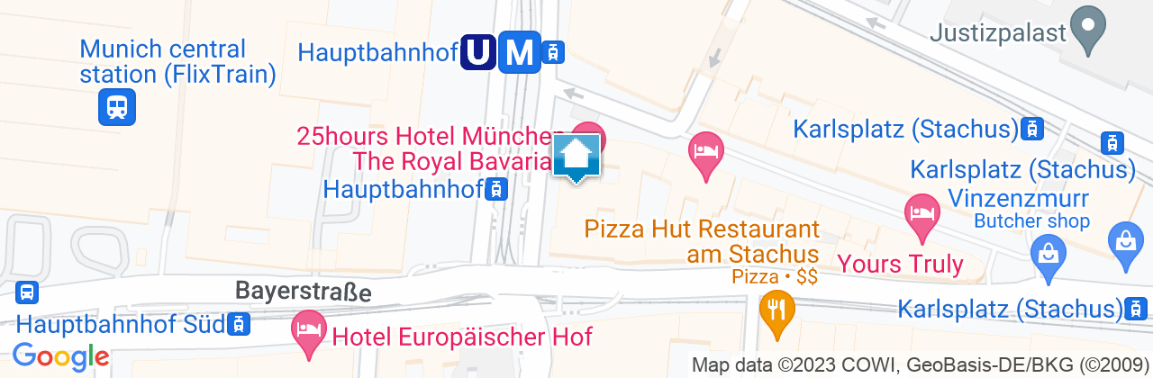 Im prunkvollen Gebäude am Bahnhofplatz 1 hat das 25hours Hotel München The Royal Bavarian seinen Platz in München gefunden. Ein Haus mit einer eigenen Geschichte: Was im vergangenen Jahrhundert noch als Oberpostamtsgebäude und königliche Telegrafenstation diente, ist heute Treffpunkt für Reisende und Stadterkunder. Genau da, wo München rau, urban und wild pulsiert – im Zentrum der Stadt. 165 Zimmer warten in fünf Kategorien auf die Gäste: Dienstbotenkammer, Herrschaftszimmer oder Adelsgemach sowie Schwanen- und Pfauen-Suiten sind Rückzugsorte mit unterschiedlich inspirierten Welten. Herzstück des 25hours Hotel The Royal Bavarian ist das Restaurant NENI sowie das NENI Deli. Die Boilerman Bar im 1. Stock ist der perfekte Treffpunkt für Kommunikation und ungezwungene Kontakte. Und das entspannte Burger-Joint Burger de Ville darf in der bayrischen Landeshauptstadt auch nicht fehlen.Zusatzinformationen