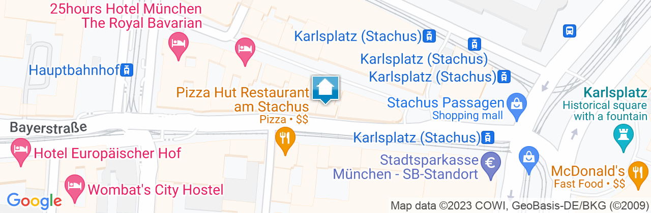 Nehmen Sie den Ausgang „Bayerstraße Süd“ und laufen Sie Richtung Karlsplatz Stachus bis zur Bayerstraße 2.