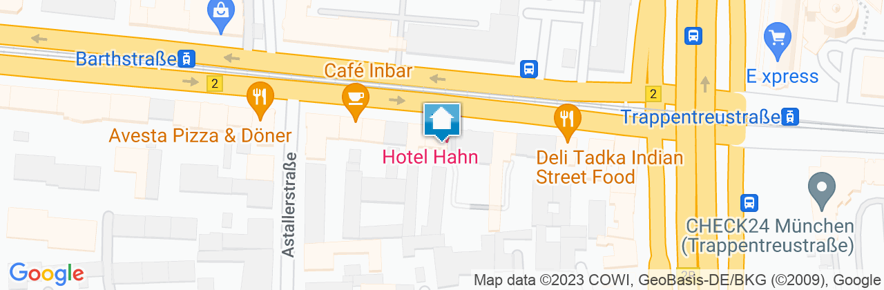An der Station "Trappentreustraße" aussteigen und zu Fuß etwa 100 Meter in Fahrtrichtung links die Landsberger Straße entlang zum Hotel.