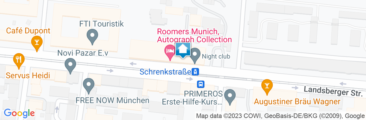 Einstieg Hauptbahnhof Süd in die Tram 18 Richtung Gondrellplatz oder Tram 19 Richtung Pasing Bahnhof. Nach einer Haltestelle, Schrenkstraße die Tram wieder verlassen. Das Hotel befindet sich in Fahrtrichtung rechts.