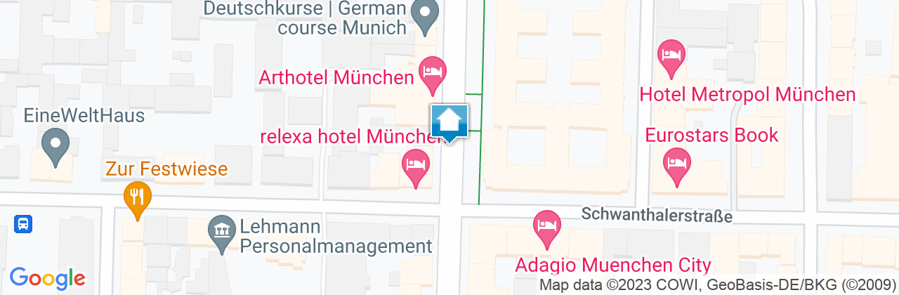Von dem Flughafen 'Franz-Josef-Strauß' fahren Sie ca. 40 Minuten. Nehmen Sie die S-Bahn-Linie S1 oder S8 oder Lufthansa Shuttle Bus zum Hauptbahnhof. Von da nehmen Sie den Ausgang 'Süd-Bayerstraße'. Biegen Sie rechts in die Bayerstaße ab und an der nächsten Ampel links in die Paul-Heyse-Straße. Wir befinden uns an der rechten Seite, auf der Nummer 10.