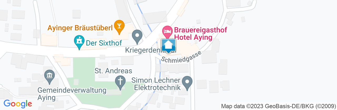Das familiengeführte ****-Superior Hotel Brauereigasthof Hotel Aying liegt im Dorfkern von Aying, einer Gemeindein Oberbayern rund 25 Kilometer südöstlich von der Landeshauptstadt München entfernt. Das historische Ensemble mit Gasthof und Herrenhaus, dem Museum Sixthof, der hauseigenen Privatbrauerei Aying und weiteren exklusiven Räumlichkeiten ist einzigartig.