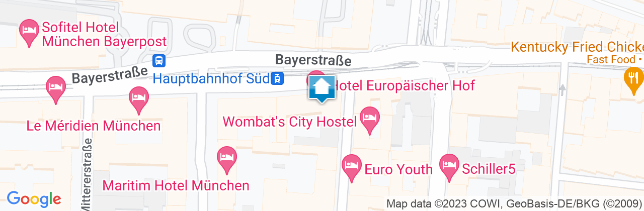 Das 3-Sterne-Hotel Europäischer Hof bietet mit seiner idealen Lage direkt gegenüber des Münchener Hauptbahnhofes und Verkehrsknotenpunkt mit allen Bussen, Straßenbahnen, U-Bahnen und S-Bahnen einen hervorragenden Ausgangspunkt, um das Münchener Lebensgefühl, diese geglückte Kombination aus bayrischer Tradition und einer dynamischen Metropole, zu erleben.Nach nur 180 Schritten vom Hauptbahnhof Gleis 11 dürfen wir sie an unserer Rezeption begrüßen.