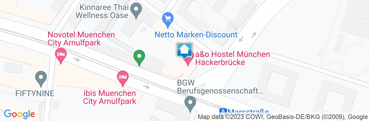 Mit der Bahn bis München-Hauptbahnhof DB. Durch den Ausgang Hauptbahnhof-Nord den Bahnhof verlassen und die Tram 16 Richtung Romanplatz oder die Tram 17 Richtung Amalienburgstraße nehmen. Nach 4 Stationen an Haltestelle Marsstraße aussteigen, das a&o München Hackerbrücke befindet sich in Fahrtrichtung auf der rechten Seite.