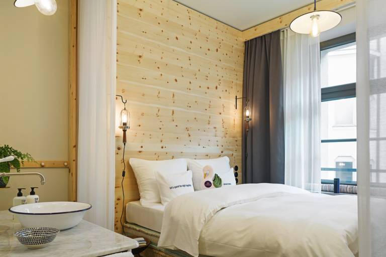 In den 18qm großen Dienstbotenkammern lässt sich nach einem langen Tag in der Stadt wunderbar entspannen. Ausgestattet mit einem Queensize-Bett, bieten sie genug Platz für zwei. Materialien und Farben erzeugen eine einfache aber gemütliche Atmosphäre. FREITAG oder canvasco-Tasche, UE Boom Bluetooth-Lautsprecher und kostenfreies high-speed W-Lan runden das Angebot ab.
