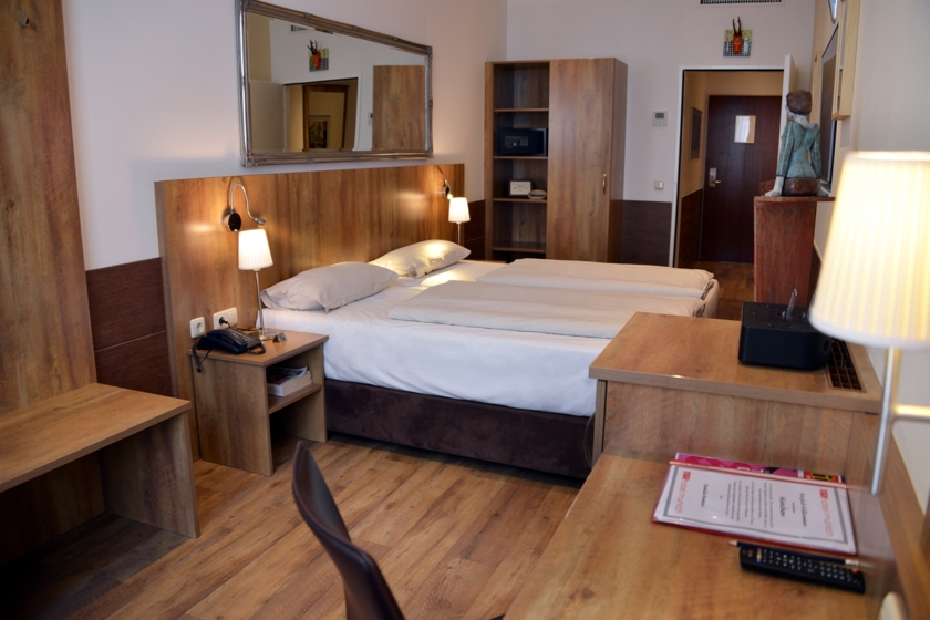 Unsere stilvoll eingerichteten und klimatisierten Zimmer bieten ein gelungenes Zusammenspiel aus modernem Wohnstil und wohliger Gemütlichkeit. Selbstverständlich sind alle Zimmer mit zwei Einzelbetten (stehen nebeneinander), Dusche/WC, Fön, Minibar, Sat-TV, Flachbild-TV, Direktwahltelefon, Safe, Dockingstation und W-Lan ausgestattet. Kostenlose W-Lan-Nutzung im gesamten Haus. Der Zimmerpreis versteht sich inklusive Frühstück.