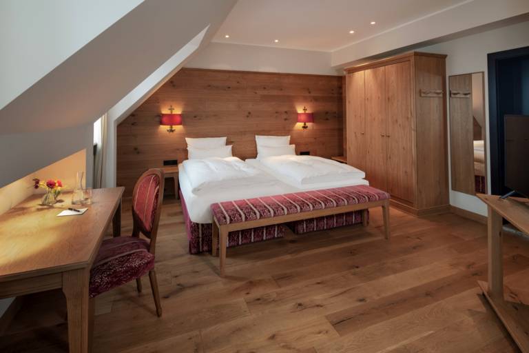 Je ein Zimmer im alpinen Stil und im klassischen Stil, die jeweils über ein geräumiges Wohnzimmer verfügen - im Alpenzimmer mit einer großen Eckbank, im anderen Zimmer mit einer klassischen Couchgarnitur. Das Schlafzimmer im Alpenzimmer verfügt über ein großes, romantisches Himmelbett, das andere Zimmer hat ein Doppelbett. Zur Grundausstattung gehören auch hier ein Schreibtisch, eine individuell regulierbare Klimaanlage, ein Zimmersafe, eine Minibar und ein Flachbildschirm TV. Im Bad stehen Pflegeprodukte zur Verfügung. Die Zimmergröße beträgt ca..45 m².