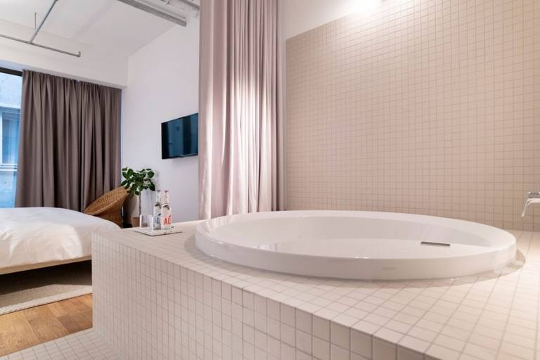 Downtown Jacuzzi • 30-35m² • Bequemes Kingsize-Bett • $$ Jacuzzi $$ • Balkon • Superschnelles WLAN München • Smart TV mit Apple TV und Android Connect • Dimmbare Beleuchtung • Safe im Zimmer • Individuell gesteuerte Klimaanlage • Visuell und akustisch isolierte Badezimmer • Kein Schrank oder Zimmertelefon