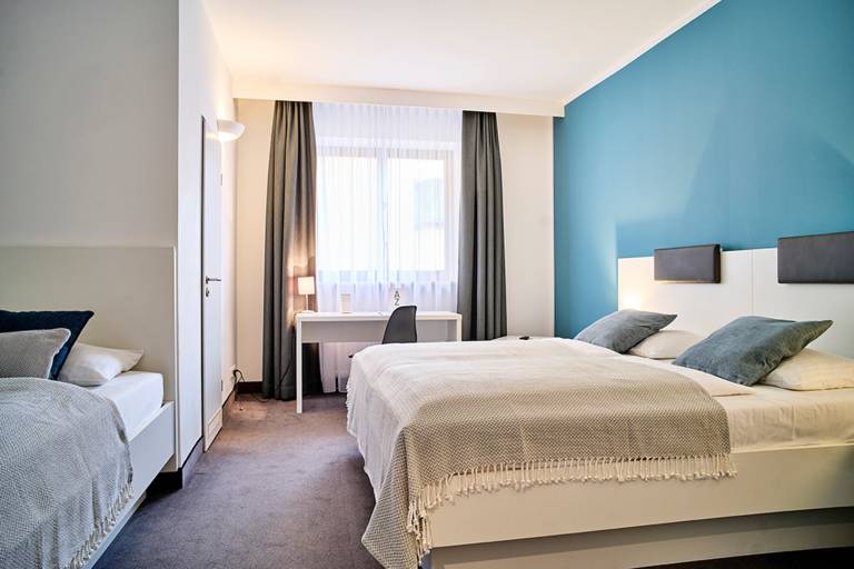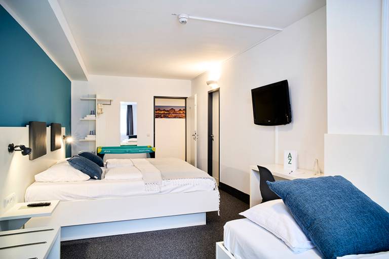 Unsere Dreibettzimmer sind größtenteils mit einem Doppelbett (2 getrennte Matratzen 0,90mx2,00m) und 1 Einzelbett oder 2 Twinbetten, die man auseinander oder zusammenschieben kann und einem Einzelbett ausgestattet. Jedes Zimmer verfügt über einen Schreibtisch mit Stuhl, weitere Sitzgelegenheiten, Telefon, Radio, TV, Lärmschutzfenster und Kofferablage. Das Badezimmer hat entweder eine Regen-Dusche oder Badewanne,WC, Fön, sowie ein Haar- und Körperduschgel von Alpin Spa. Kostenfreies Wlan ist im ganzen Haus verfügbar.