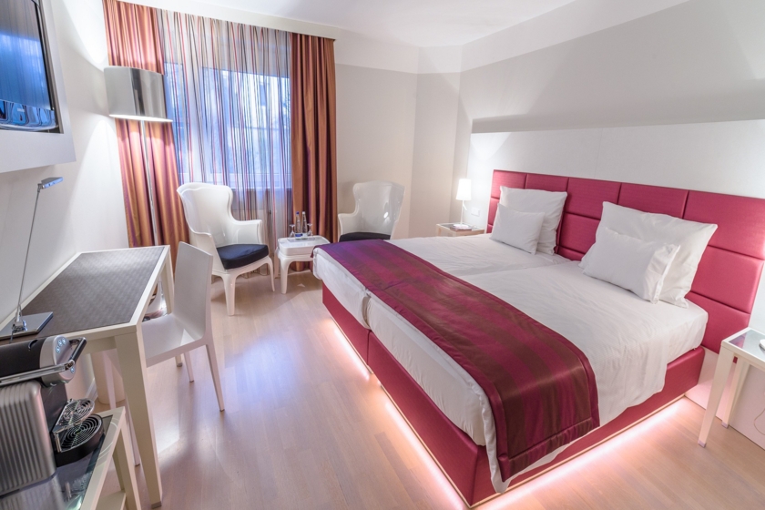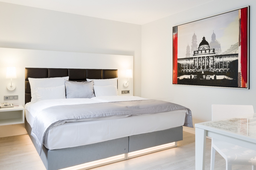 Die modern Doppelzimmer der Standard Kategorie mit King Size Bett und einer Größe von ca. 22 Quadratmetern sind mit dezenten, warmen Farben versehen und verfügen über eine individuell regulierbare Klimaanlage, einen Schreibtisch, einen Safe, einen Flachbild Fernseher, eine Minibar und ein Telefon mit Voicemail Funktion. Die design orientierten und immer ruhig zum Garten und Innenhof gelegenen Superior Zimmer mit großen Kingsize-Betten und einer Größe von 26 bis 35 Quadratmetern verfügen zusätzlich über einen Holzboden, eine Nespresso-Maschine, Regendusche und hochwertige Toilettenartikel der Marke ELEMIS SPA.