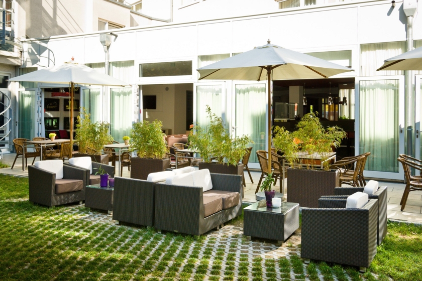 Die mit behaglichen Sitzmöbeln ausgestattete Sonnenterrasse im ruhigen Garten des Hotels lädt zum Wohlfühlen ein.