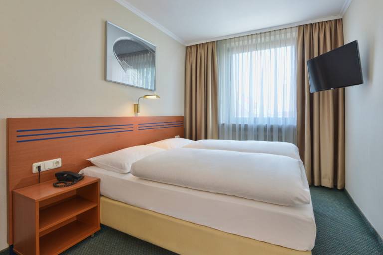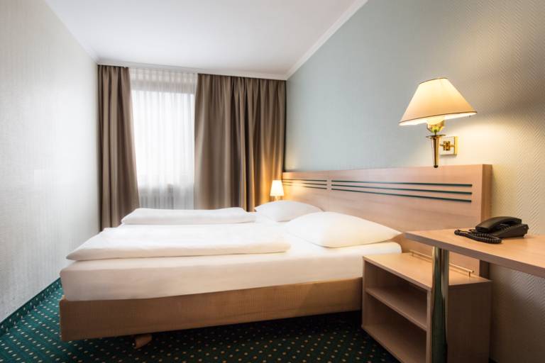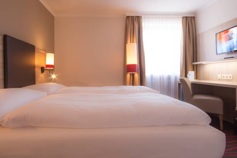 Helle und farblich abgestimmte Zimmer mit modernem Chic. Ideal für einen längeren Aufenthalt. Unsere Standard Zimmer erwarten Sie mit frischem Anstrich und optimaler Raumaufteilung. Zu den Annehmlichkeiten gehören ein Schreibtisch mit einer kostenfreien WiFi-Internetverbindung sowie ein moderner Flachbild-TV und natürlich ein Minibarkühlschrank. Doppel/Zweibett City Standard (Front- / Seitenstraße) / Doppelbett mit zwei Einzelbetten (je Bett 90 x 200 cm) / 19 m² - 22 m² / nicht klimatisiert / Auswahl zwischen zwei Betten nebeneinander oder getrennt / 100% Nichtraucher / iPad Zimmersafe