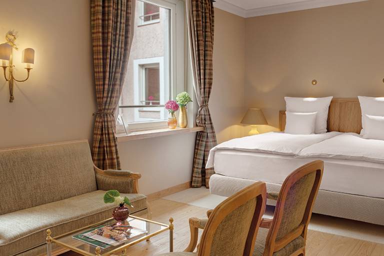 Für höchsten Komfort und eine besonders großzügige Atmosphäre: Die klassischen Junior Suiten im Hotel Excelsior by Geisel bieten einen getrennten Wohn- und Schlafbereich sowie ein luxuriöses Bad. Beim Design steht der Sinn für Tradition im Mittelpunkt. Möblierung und Einrichtung der Suiten stammen von Handwerksbetrieben aus der Region und entstanden aus hochwertigen Materialien. Eleganter Landhausstil im Münchner Zentrum… Alle unsere Suiten verfügen über eine extra Sitzecke, in der Sie auch ganz ausgezeichnet Gäste empfangen können. Die Kaffeemaschine in der Suite versorgt Sie jederzeit mit frischem Kaffee.