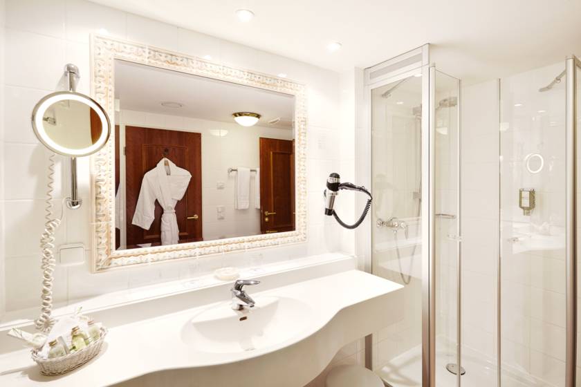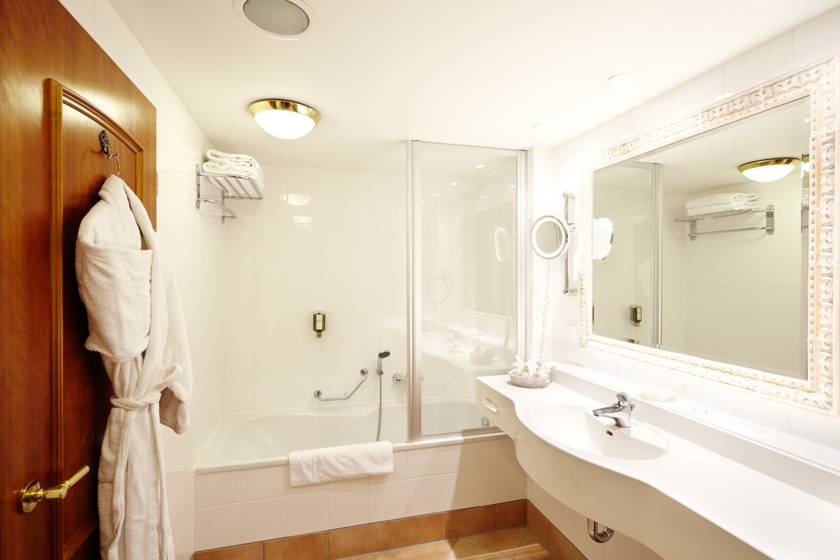 - Designfußboden Eiche - Kingsizebett mit Überlänge (1,80 x 2,05 m) - Zimmergröße ca. 25 m², besonders ruhige Lage - auf Wunsch trennbare Betten, max. ein Zustellbett möglich - WLAN inklusive - individuell regelbare Klimaanlage - Full HD Flatscreen-TV mit Sky-TV und Radio - großzügiges Badezimmer mit Dusche oder Badewanne, Fußbodenheizung, Fön - hochwertige Pflegeprodukte, Bademantel auf Wunsch - Sitzbereich mit Tisch, Schreibtisch und Safe - Schallschutzfenster, überwiegend mit elektrischen Jalousien