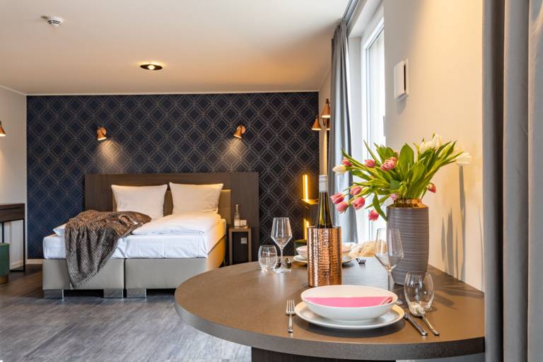 Geradezu majestätisch können Sie sich in unseren MAjestic Serviced Apartments mit rund 37 m2 niederlassen: . Großes Boxspringbett . Bad in Marmoroptik mit Tropendusche . separates WC . Hochwertige, vollausgestattete Kitchenette mit Induktionskochfeld, Wasserkocher, Kühlschrank, Mikrowelle, Geschirrspüler und Markengeschirr . 43'' LED TV