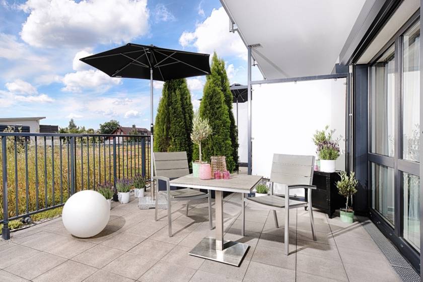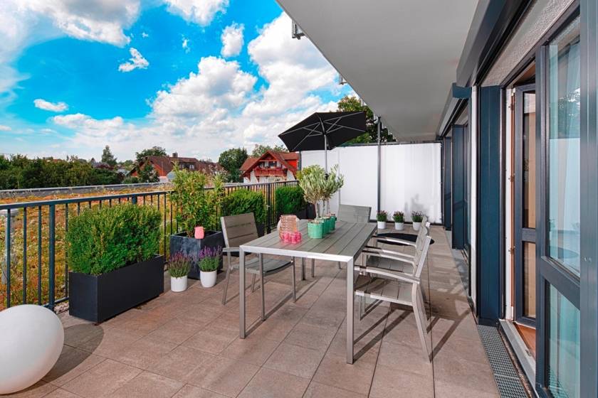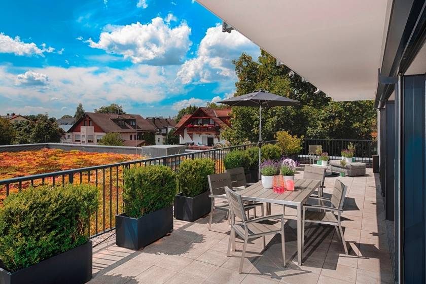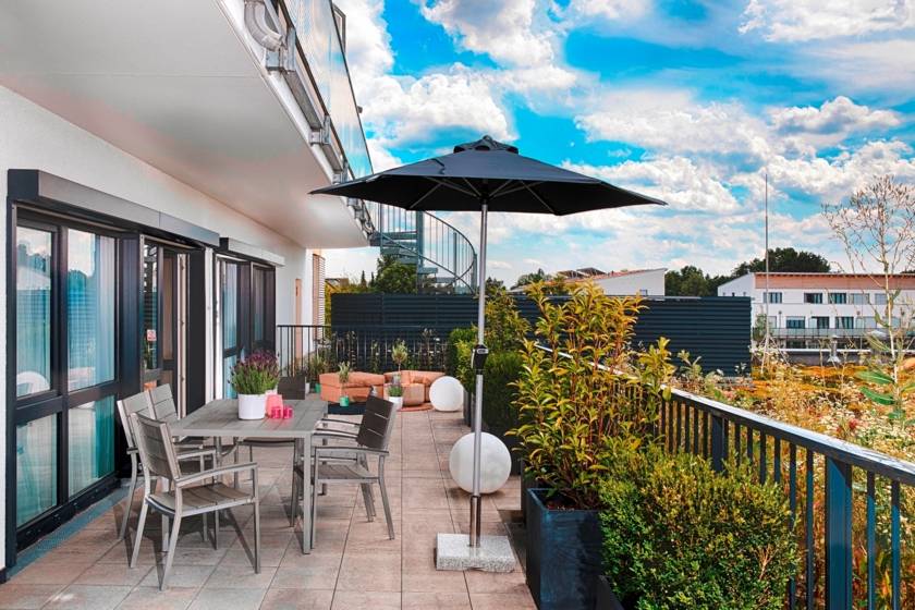 Next Level Business Apartment mit Terrasse und Blick in's Grüne : 29 m² Wohnraum für 2 Personen werden hier ergänzt durch 18 m² Terrasse. Für alle, die gerne auf der eigenen Terrasse frühstücken oder abends den Tag unter dem Sonnenschirm ausklingen lassen möchten. Unser helles, stylisches Apartment mit Dachterrasse erwartet Sie mit: - einer großen möblierten Terrasse - ruhiger, der Straße abgewandter Lage mit Blick in's Grüne - einem bequemen Doppelbett mit hochwertigen Federkernmatratzen - einer Kitchenette mit Kühlschrank, Senseo-Kaffemaschine, Induktionsherd und Mikrowelle sowie ausreichend Geschirr und Kochutensilien - einer Ess-/Arbeitstisch Kombination - einem großzügigen Badezimmer mit Fussbodenheizung, ebenerdiger Regen-Dusche, Kosmetikspiegel und Haarfön - Nicht fehlen darf natürlich auch ein Zimmersafe, ein 40“ Flatscreen TV sowie eine Klimaanlage