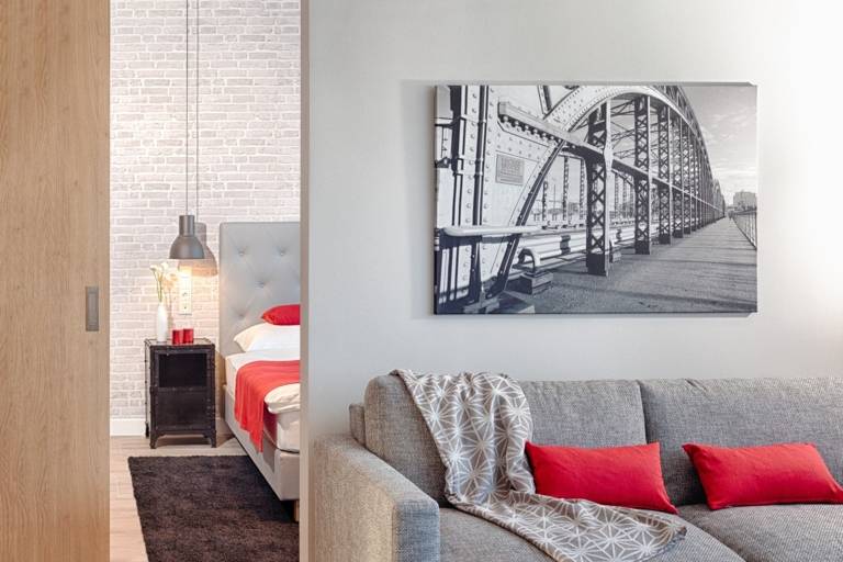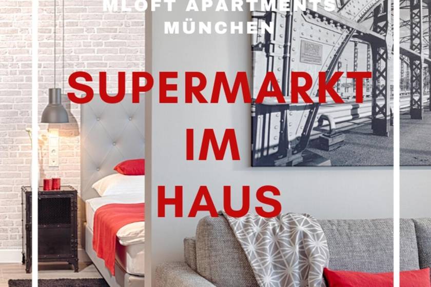 Loft-Style auf 29 m² für bis zu 2 Personen - ausgestattet mit allem Wichtigen für Ihren individuellen Aufenthalt in München - nicht nur für Geschäftsreisende: - bequemes Doppelbett mit hochwertigen Federkernmatratzen - Kitchenette mit Kühlschrank, Senseo-Kaffeemaschine, Induktionsherd und Mikrowelle sowie ausreichend Geschirr und Kochutensilien - Ess-/Arbeitstisch Kombination - Großzügiges Badezimmer mit Fußbodenheizung, ebenerdiger Regen-Dusche, Kosmetikspiegel und Haarfön - Nicht fehlen darf natürlich auch ein Zimmersafe, ein 40" Flatscreen TV sowie eine Klimaanlage