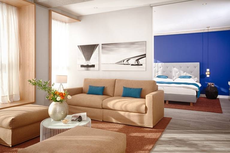 43 m² für bis zu 4 Personen in einem coolen 2-Raum Apartment mit separatem Schlafzimmer. Ideal für Familien oder Gäste, die gerne ein separates Schlafzimmer haben. Es erwartet Sie - 1 bequemes Doppelbett mit hochwertigen Federkernmatratzen im Schlafzimmer sowie ein Sofa im Wohnraum, das zu einem vollwertigen Doppelbett umfunktioniert werden kann. - eine voll ausgestattete Kitchenette mit Kühlschrank, Senseo-Kaffeemaschine, Induktionsherd und Mikrowelle sowie ausreichend Geschirr und Kochutensilien - Ess-/Arbeitstisch Kombinationen - Ein großzügiges Badezimmer mit Fußbodenheizung, ebenerdiger Regen-Dusche, Kosmetikspiegel und Haarfön - Nicht fehlen dürfen natürlich auch ein Zimmersafe, 2 x 40" Flatscreen TV sowie eine Klimaanlage