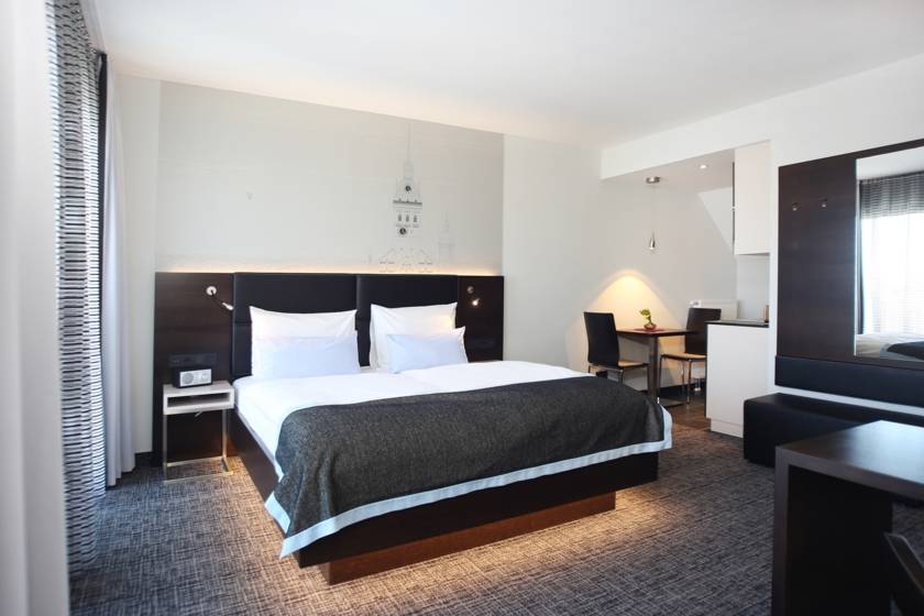 • Twin-Bett (2x0,90m) • Individuell regulierbare Klimaanlage & Schallschutzfenster • ca. 24qm mit Blick zum Innenhof • 40“ Flat-TV mit nationalen und internationalen Sendern • Tivoli Radio mit MP3-Player Anschluss, Telefon, Safe • Kostenloser WLAN & LAN-Internetanschluss • Großer ausziehbarer Schreib- bzw. Esstisch • Kaffee- und Teestation • Kitchenette mit Herd und Mikrowelle, Kühlschrank • Badezimmer mit ebenerdiger Dusche, Föhn, Kosmetikspiegel und Handtuchwärmer • Zimmer mit Verbindungstür verfügbar