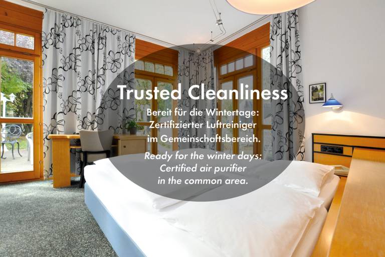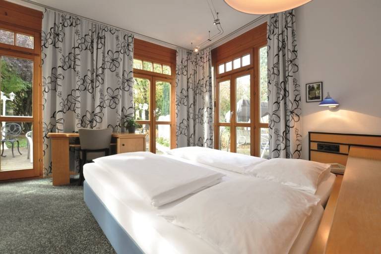 Erholung garantiert 25 qm lichtdurchflutetes Doppelzimmer mit großen Fensterfronten zum Garten im EG oder 1. Stock 2 Boxspringbetten á 100x200 cm Schreibtisch Sat TV, Telefon, Wasserkocher und gratis WLAN Minibar (die erste Füllung ist gratis) Bad mit Dusche und Kosmetikspiegel Auf Anfrage mit Terrasse und mit Zugang in den hauseigenen Garten.